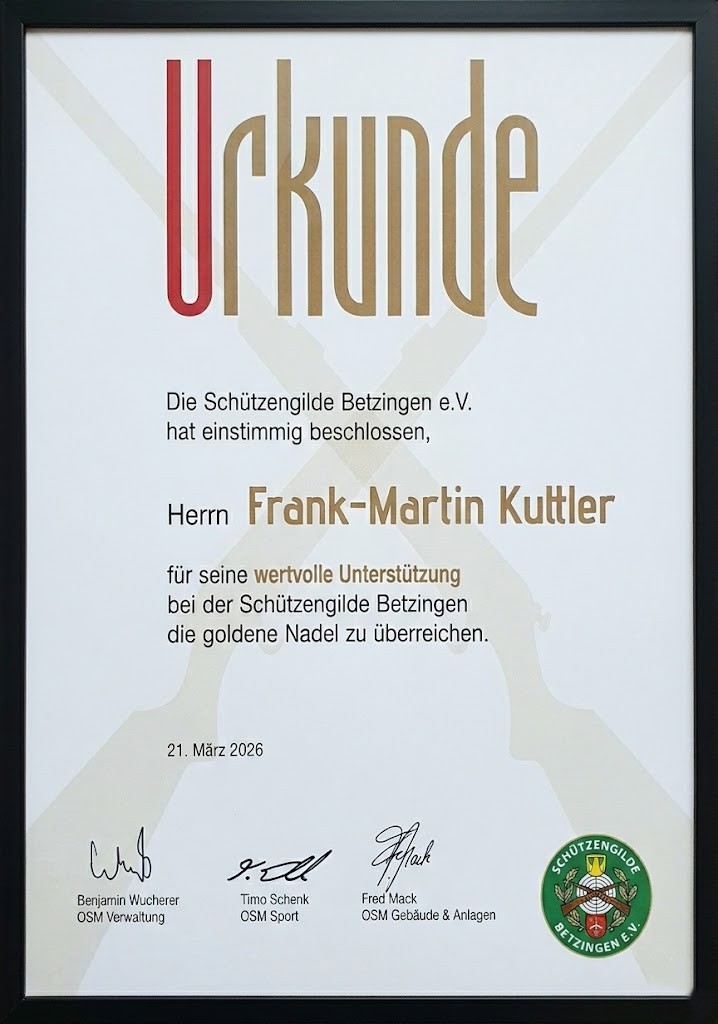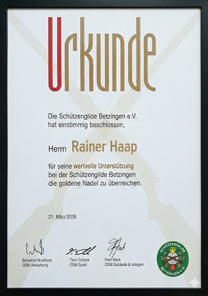 Bei der diesjährigen 70. Jahreshauptversammlung der Schützengilde Betzingen konnte OSM Verwaltung, Benjamin Wucherer, insgesamt 35 Mitglieder begrüßen. Ein besonderer Gruß galt den anwesenden Ehrenmitgliedern Fritz Pfingsttag, Klaus-Michael Tront, Dietmar Hepper, Jean-Pierre Loebl und Frank Heider, der auch amtierender Schützenkönig ist. Zum Jahresende 2025 zählte der Verein 197 Mitglieder, 149 Herren und 48 Damen.