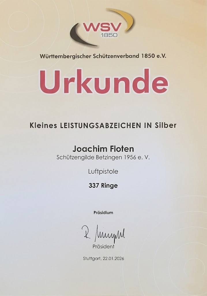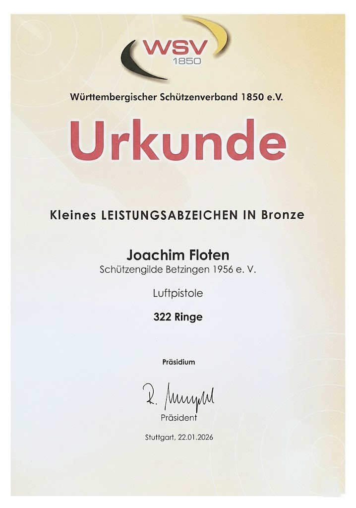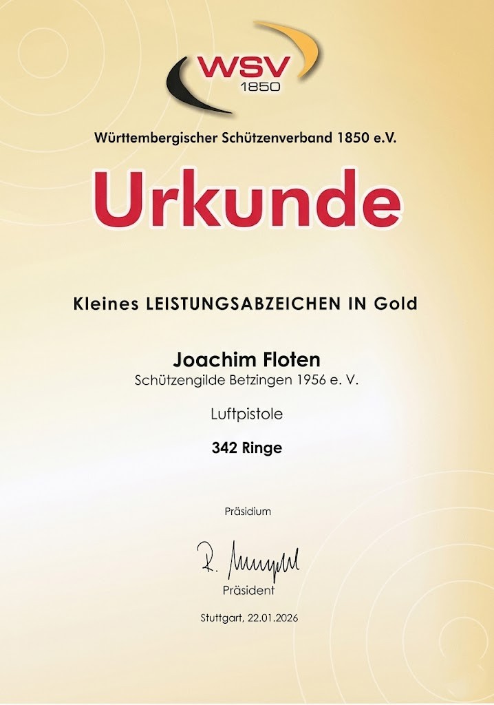 Das Leistungsabzeichen des Württembergischen Schützenverbandes erhielt Joachim Floten in Bronze (322 Ringe), Silber (337 Ringe) und Gold (342 Ringe) in der Disziplin Luftpistole.